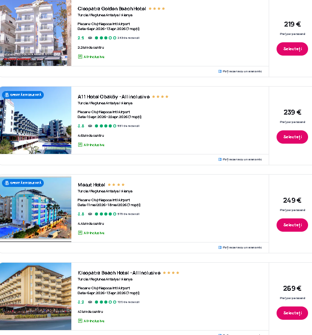 Fie că alegi stațiuni populare precum Antalya, Bodrum, Marmaris sau Kusadasi, fiecare oferă o experiență unică: de la plaje liniștite, la viață de noapte vibrantă sau excursii culturale.